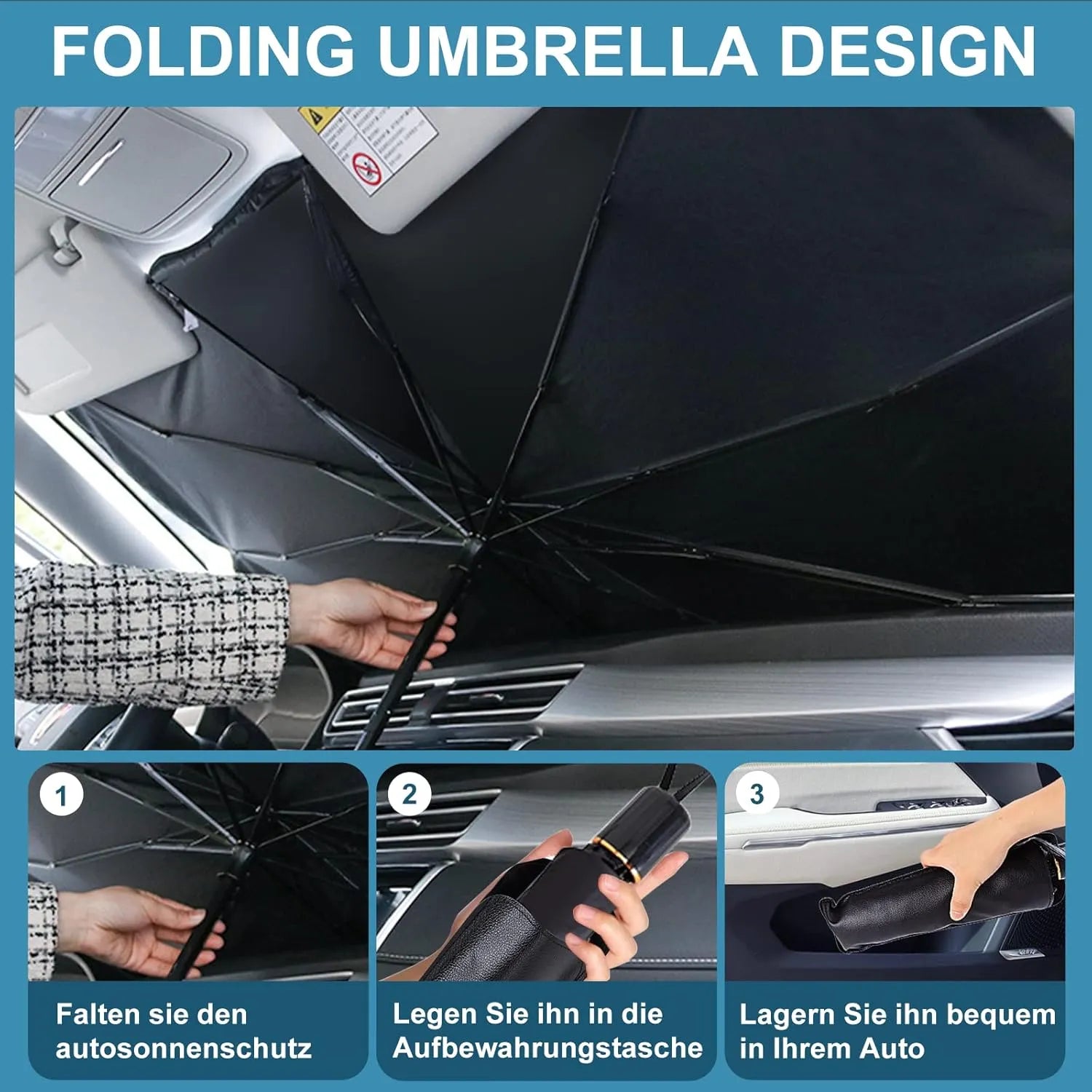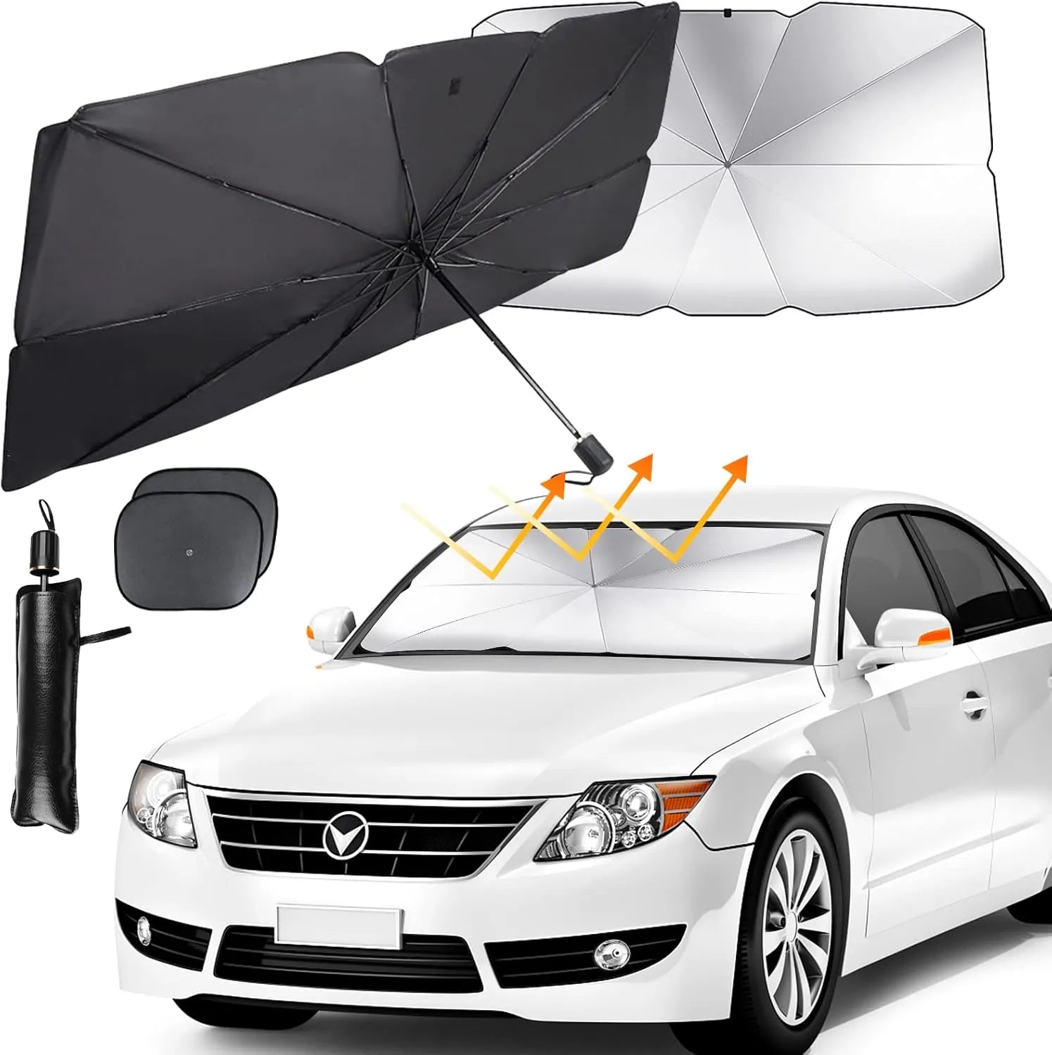 هل سئمت من سخونة المقاعد وتكسير لوحات القيادة؟ مظلة السيارة الشمسية هي حلك الذكي القابل للطي لحماية سيارتك من أشعة الشمس القاسية والأشعة فوق البنفسجية الضارة. مصممة لتناسب معظم المركبات، ويمكن طيها كالمظلة العادية، فهي صغيرة الحجم ومريحة وفعّالة للغاية في حماية الجزء الداخلي من سيارتك.