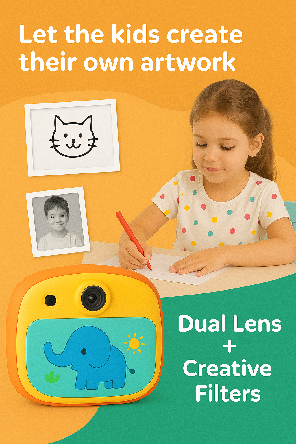 كاميرا أطفال ممتعة ومبتكرة مع طباعة فورية! تتميز بعدسات مزدوجة، و28 فلترًا، ووضع رسم، وألعاب مدمجة. هدية مثالية لتحفيز خيال الأطفال وإمتاعهم.