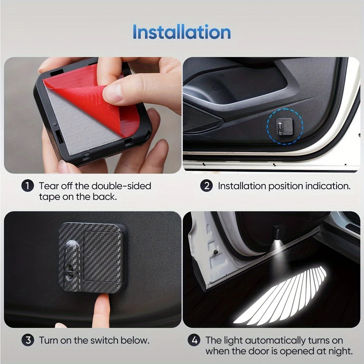 حسّن مظهر سيارتك وسلامتها مع مصباح LED لباب السيارة ، بتصميم أجنحة ملائكية عالي الوضوح . سهل التركيب دون الحاجة إلى أسلاك، يعمل هذا المصباح المحيط بالبطارية تلقائيًا عند فتح الباب، مما يخلق تأثيرًا بصريًا مذهلاً ورؤية ليلية أفضل.